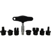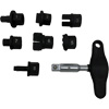 • Contains a T-handle with a square drive ball lock and 7 adapters